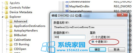 在“开始”菜单的搜索栏中输入“regedit”打开系统的注册表编辑器,找到“HKEY_CURRENT_USER/Software/Microsoft/Win/CurrentVersion/Explorer/Advanced”文件夹,右键单击该文件夹选择“新建DWORD值”,接着将其改名为“ThumbnailLivePreviewHoverTime”。然后将此项值修改为十进制数值,可随意填写一个三位数的值,例如200、300。修改完后关闭注册表,重启电脑生效。