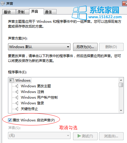 在控制面板中找到“声音”并打开,在声音控制标签中去掉系统默认勾选的“播放Win启动声音”。