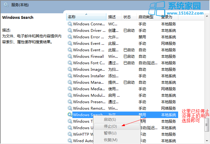 在“开始”菜单的搜索栏中输入“services.msc”回车打开程序,在“服务”中找到“Windows Search”,右键单击选择“停止”该服务即可。