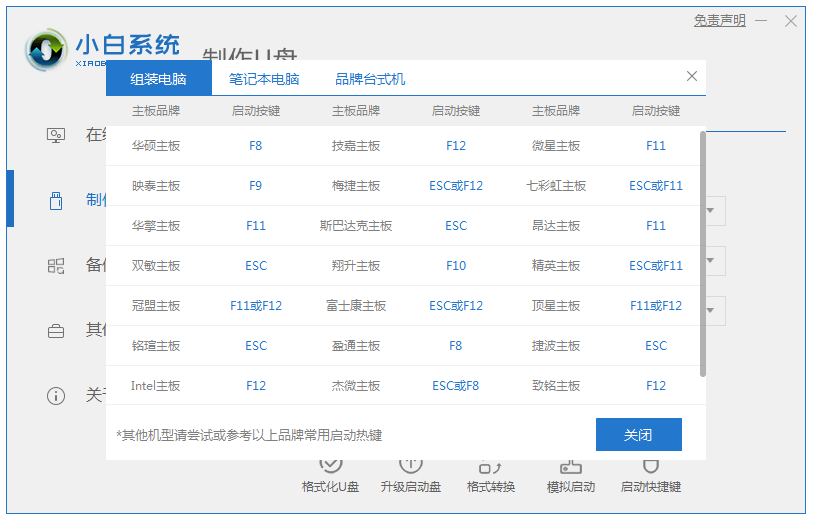 步骤八:最后,小白U盘启动工具就制作完成了,然后看怎么重装进入PE。首先你可以通过软件上的“快捷键”查询找到相应主板的bios启动热键,接着在开机画面出现时按快捷键调出启动菜单设置usb设备为第一启动顺序。
