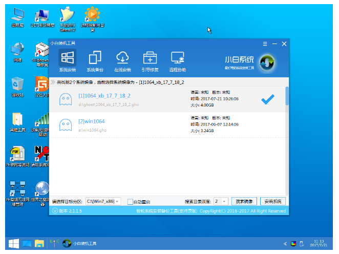 步骤十:进入到小白系统pe桌面后,电脑会自动打开小白装机工具并检测到U盘里面的系统镜像,然后选择系统目标安装盘符(一般都是C盘)以及勾选系统镜像文件,最后点击右下角的安装系统即可。