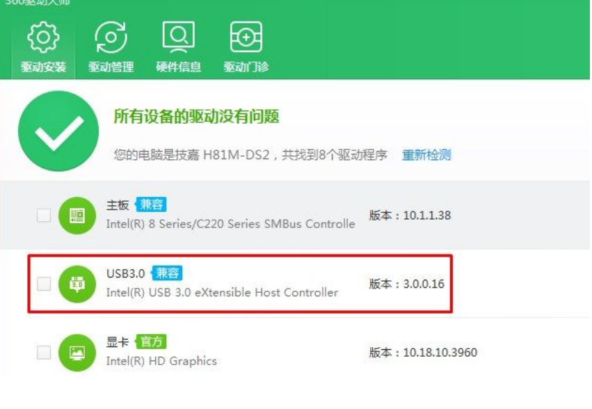 3、进入安全模式后,这种情况下一般鼠标键盘是可用的,那就只要更新一下usb驱动即可。自行下载安装好360驱动大师或者驱动精灵软件,然后检测更新usb3.0驱动完成后,重启到正常模式下鼠标键盘就可以用了。