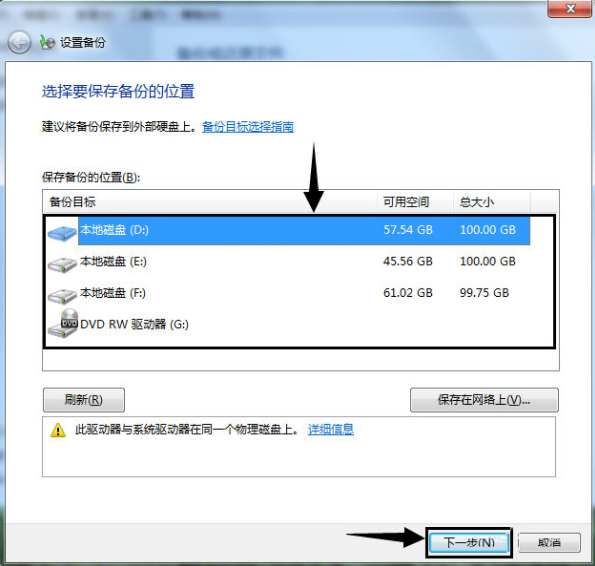 4、启动好备份以后,选择一个备份需要的盘符,默认选择D盘,但可以改成别的,然后点击下方的【下一步】。