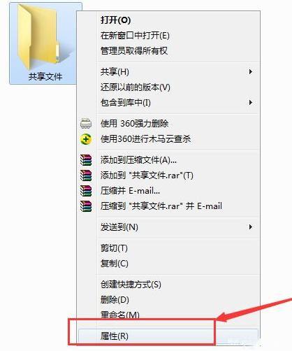 1、在共享的文件夹上点击鼠标右键,然后选择“属性”。
