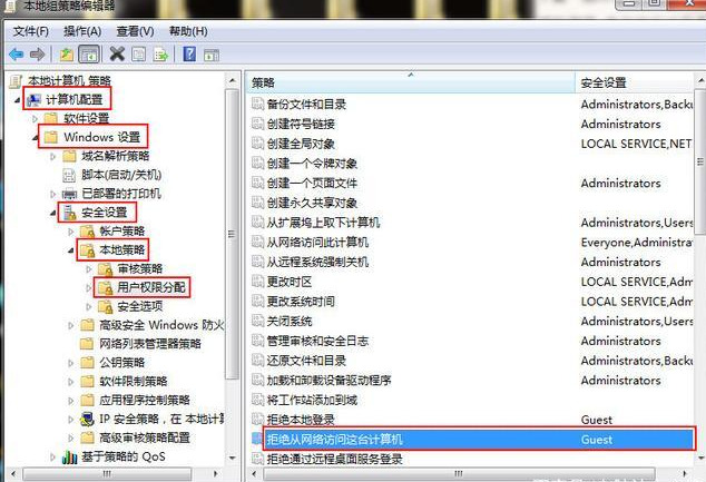 3、删除用户权限分配选项中的“拒绝从网络访问这台计算机”中的Guest用户或组,点击确定。