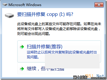此时会有两个选择: 1、扫描并修复(推荐) 2、继续,但不要扫描 万分警告 在确定你U盘里面有重要资料时千万不能点第一个选项:扫描并修复(推荐)