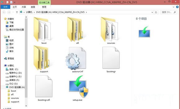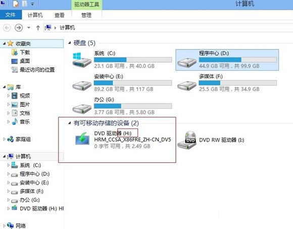 接着返回到计算机的主页面就会看到在有可移动存储的设备那里多了个DVD驱动器没错这就是你Win8镜像的虚拟光驱为什么呢因为Win8自带虚拟光驱程序我们要做的是记下Win8镜像虚拟光驱的盘符因为下面一步会用到。