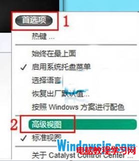 2、在弹出的设置窗口,找到右上角的“首选项”按钮并单击鼠标左键,在下拉菜单中点击“高级视图”。