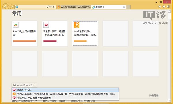 1、例如,小编使用“WP9”IE11访问IT之家旗下的几家网站,例如下图中的标签页;