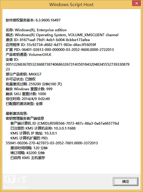 Win+R 运行slmgr.vbs /dlv,查看软件授权服务版本为:6.3.9600.16497