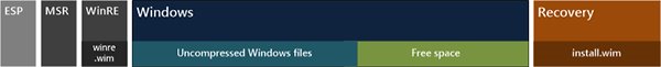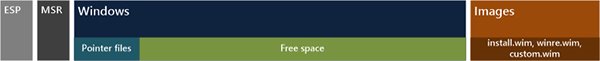 映像分区将同时包含多个压缩版映像文件,例如install.wim、winre.wim以及custom.wim;Windows分区全部使用档案文件(pointer file)的压缩版映像,剩余磁盘空间主要用于存储用户后期写入的新文件,例如注册表、页面文件、休眠文件、个人数据以及第三方Modern应用或更新补丁。