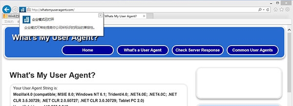 ▲开启IE11企业模式后,使用“User Agent”查询后,为标准版IE8浏览器