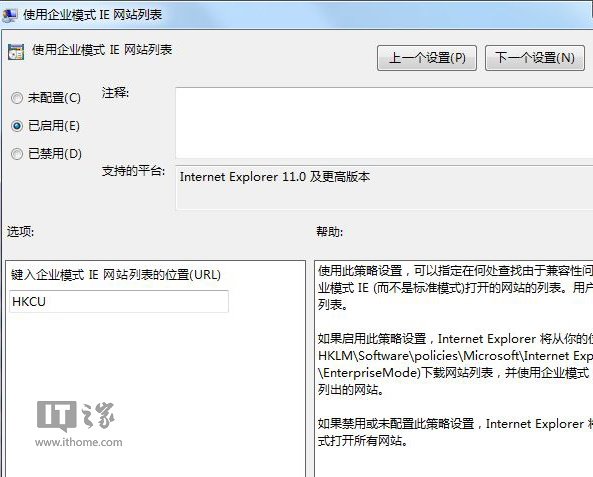 9、双击打开“使用企业模式IE网站列表”,配置为“已启用”,IE网站列表位置输入“HKCU”,应用生效。