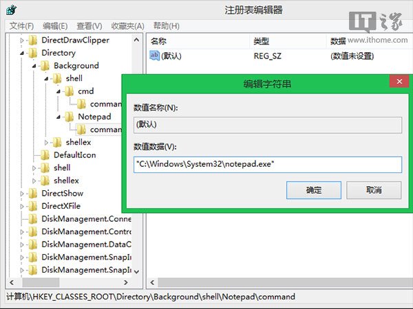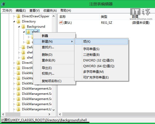 3、依次定位至HKEY_CLASSES_ROOT\Directory\Background\shell路径,在shell旗下新建“项”,例如记事本“NotePad”、“QQ”、截图工具“SnippingTool”,Win8/Win8.1专属滑动关机“SlideToShutDown”等项目。