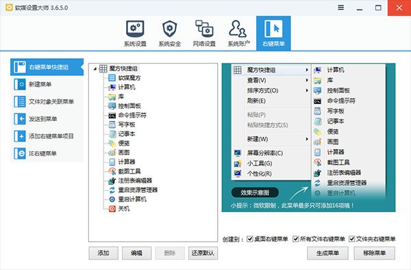 除此之外,使用魔方(点此进入官网下载)中的魔方设置大师,即可一键把喜欢的系统组件、第三方应用程序加入系统右键菜单,例如“魔方快捷组”,完美支持32位和64位的Win8.1、Win8、Win7、Vista等系统。