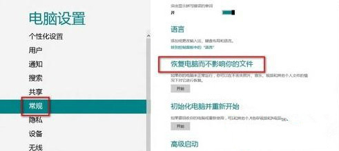 1、如果Windows 8能够启动,选择Metro控制面板应用程序,点击“常规”选择“恢复电脑而不影响你的文件”选项去重新安装Windows并同时保留数据,如果选择“初始化电脑并重新开始”选项的话,那么就可以恢复Windows并同时删除数据和应用程序。