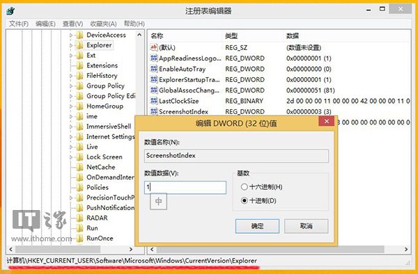 4、选择Explorer ,将右侧的ScreenshotIndex值改为1,重启生效。