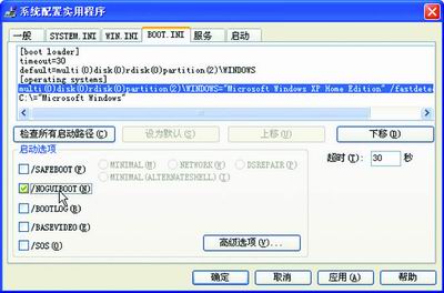 图3 对于Windows XP,我们也可以利用系统配置应用程序来修改文件。打开“开始” “运行”,在运行对话框中输入:Msconfig,点击“确定”后即打开了系统配置实用程序,点击切换到“BOOT.INI”选项页,在“启动选项”功能区域中选中“/NOGUIBOOT”复选项即可。