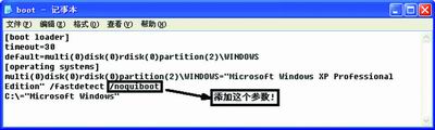 图2 在Windows 2000/XP操作系统所在那一行语句,比如:multi(0)disk(0)rdisk(0)partition(2)\WINDOWS="Microsoft Windows XP Professional" /fastdetect 后面加一个空格,再加上参数:/noguiboot,保存后,关闭Boot.ini文件,重新启动计算机看看,启动画面已经不见了。