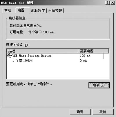 第4步 点击属性窗口中的“电源”选项卡,在“连接的设备”描述栏内将会显示有闪盘的耗电量,如图所示,笔者的爱国者32MB时尚型闪盘的耗电量是100mA。