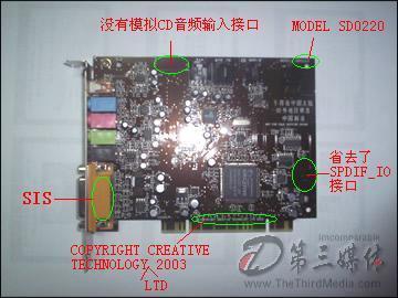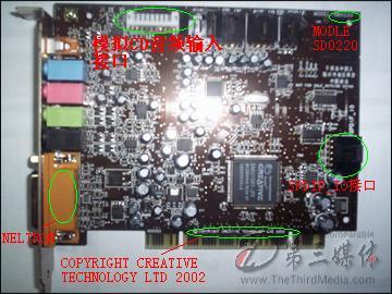 从两款声卡的正面,我们也可以找到很多不同之处,旧版有模拟CD音频输入接口和SPDIF_IO接口,而新版没有。旧版的MIDI输入/输出接口上印有“NELTRON”字样,而新版的是“SIS”。还有一点,旧版SB Live!5.1声卡的下方(PCI接口的上侧)印有“COPYRIGHT CREATIVE TECHNOLOGY LTD 2002",而在新的SB Live!5.1“特惠版”声卡上印的是“COPYRIGHT CREATIVE TECHNOLOGY LTD 2003"。