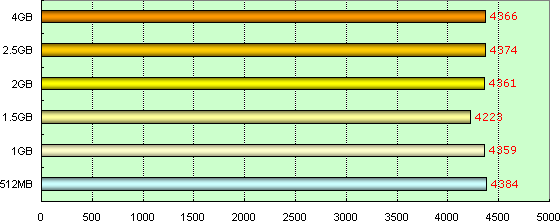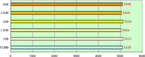 最后Piggy小编测试了3D Mark03来看看各内存容量下是否会影响了游戏执行的效能,不过在这里也出现与PC Mark04相同,也就是测试软件似乎只支持2GB的内存容量,因此超过2GB以上的内存测试当然无法完全发挥应有的效能。不过就从每项内存容量的测试看来,似乎结果也都在伯仲之间,不至于影响到一般游戏的执行效能与结果。