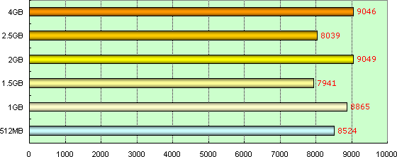 首先玩家看到的是PC Mark2002内存的测试分数,在以上的内存容量搭配下,成绩可说是起起落落,至于差距为何会呈现这样的情况,Piggy小编推测应该是测试软件出现较大误差所致,整体性看来较大的内存容量似乎有比较好的表现,而2.5GB、1.5GB与512MB由于有256MB的内存模块作搭配,也可能是这几项测试偏低的原因。