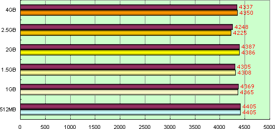 在Sisoftware Sandra2004的内存频宽效能测试中,则也呈现出不相上下的情况,除了2.5GB有稍微明显的效能差距外,其它的测试结果也告诉我们在Windows XP的作业环境下,各式的内存容量组合并不会影响到内存的效能上。