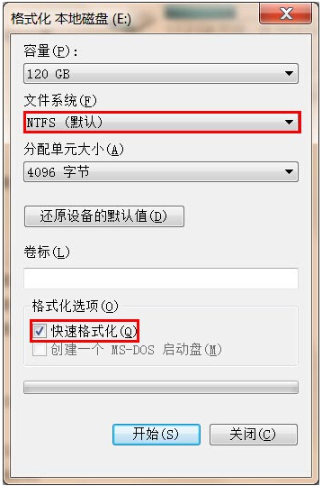 2、进入“格式化 本地磁盘(E:)”,在文件系统(F)的选项,选择“NTFS(默认)”,在“快速格式化”的选项框打勾勾。然后点击开始;更多精彩教程推荐:电脑怎样重装系统。
