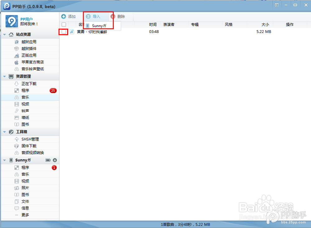2、点击喜欢的音乐下载,下载成功之后,点击PP助手的资源管理---音乐---选中下载好的音乐点击导入后等待导入即可。