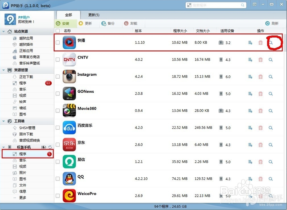2、安装完毕之后,点击程序---找到快播---右边的放大镜按钮