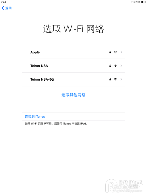 6、接下来是wifi设置,在激活时wifi是必须的,如果你没有wifi那就只能用电脑上的itunes激活了,所以最好链接wifi激活iPad:(选取好wifi会自动联网激活,这个过程需要几分钟的时间)