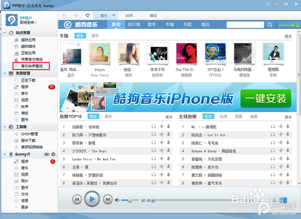 1、打开PP助手(Win)音乐铃声壁纸功能