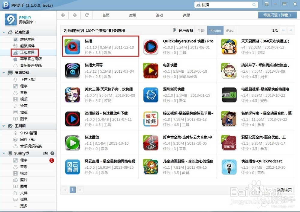 3、打开安装好的pp助手,选择正版应用进行下载:下载后安装程序即可。