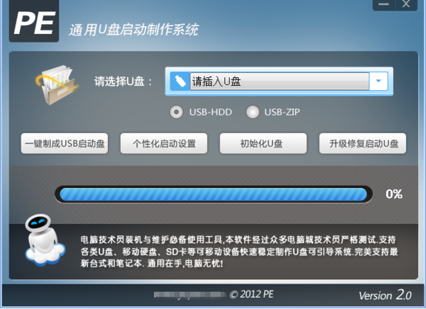 第二步:准备一个U盘,而且是比较新的USB 2.0 4G或8G容量 的U盘。将U盘插入电脑的USB端口,双击“通用U盘启动盘制作工具_V2.0(全能版)”这个软件,出现如下图的软件界面,选择第一个“一键制成USB启动盘”即可。假如电脑启动方式没有USB-HDD这一选项,也可以选择USB-ZIP的启动模式。注意一下,假如电脑上同时插了好几个U盘或银行U盾,建议把无关的USB存储设备拔出来,以防误操作删除里边的文件。
