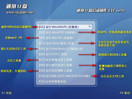 第二步:在电脑重启之前,插入U盘启动盘,然后电脑自动加载U盘内的启动系统“通用U盘启动制作工具v2.0”。如果你的硬盘不需要分区,那么此处跳过,直接看“用U盘启动盘安装系统”。如果需要对硬盘重新分区,那么选择第05项“运行DiskGenius 3.5磁盘分区”。(如下图)