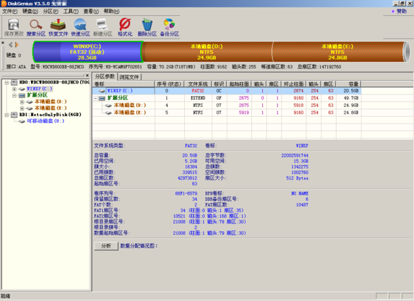 第三步:硬盘分区。进入DiskGenius分区软件后,需要注意左侧白框内的磁盘类型,图中有一个70G硬盘和一个4G的U盘。70G硬盘就是需要重新分区和安装Vista 系统的目标硬盘,而4G的U盘就是U盘启动盘。