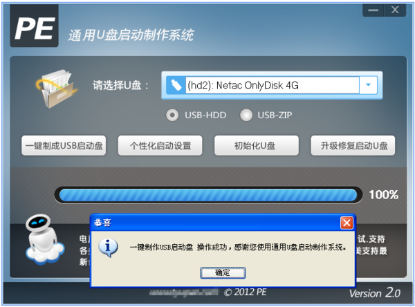 第三步:出现安全提示时,点击确定进入下一步骤。然后就开始制作USB系统启动盘,出现如下图的对话框后,表示U盘的启动程序已经安装成功。