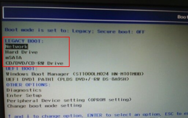 第三步:返回到BOOT界面,选择启动方式,如果是光盘安装系统,就在LEGACY BOOT下,将CD/DVD/CD_CR Drive调到第一个。按F10键保存退出。