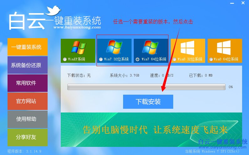 第二:运行下载的白云一键重装系统工具,选择win7 32位系统并点击下载安装(白云win732 win764位系统均为win7旗舰版)