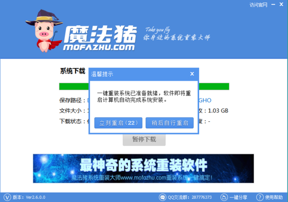 4.待windows7系统下载完毕后,魔法猪一键重装工具会提示您“一键重装系统已准备就绪,软件即将重启计算机自动完成系统安装”,点击立刻重启即可。如图四