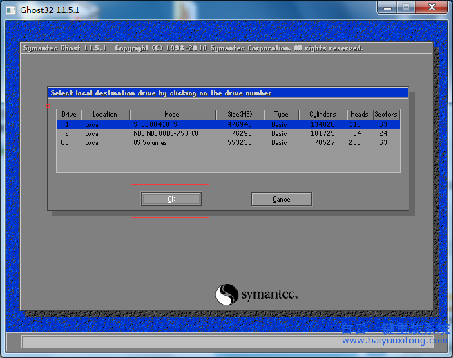 第九,选择你想把系统安装到里面的那个盘,然后点OK,这个不能点错,点错了其他盘的数据就没有了。
