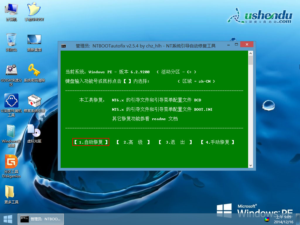3、打开修复系统引导工具后,使用数字键选择“自动修复”选项,如下图所示: