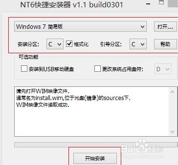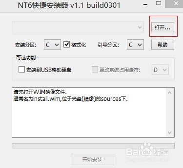 通过“打开”按钮在刚才加载的虚拟磁盘中的sources文件夹中找到install.wim文件进行安装,如图: