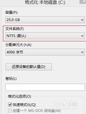 在弹出的格式化窗口中,将文件系统格式改成NTFS格式,然后单击“开始”按钮,如图:
