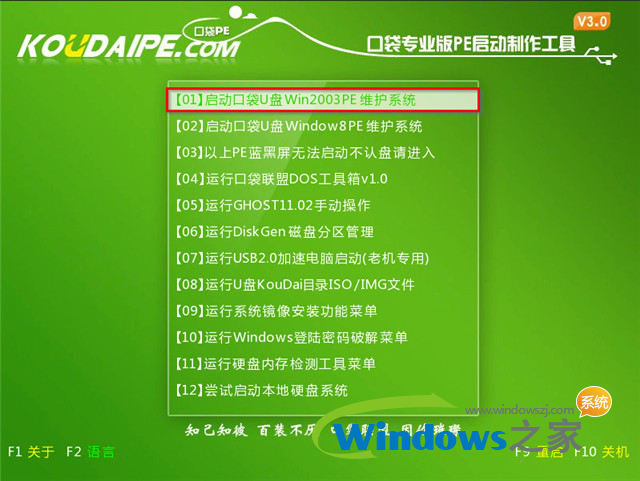 1.当我们利用启动热键进入U盘启动制作工具主菜单后,按上下↑↓方向键选择到"【01】 启动口袋U盘 Win2003PE维护系统",然后按下"回 车键",将进入Win2003PE系统,如下图: