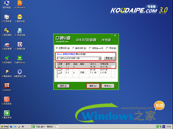 3.运行"口袋PE"工具后,该软件会自动识别GHO镜像文件(即刚才我们下载复制到U盘GHO文件夹里面的GHO镜像包)。我们只需点击"确定(Y)"按钮即可!如下图所示: