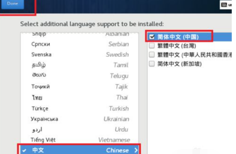 4、修改默认的语言设置。因为刚才第一步里设置的默认语言是English,这样会对软件的支持比较好,但是我们还需要添加中文支持,这样在执行脚本的时候,出现乱码的几率就更小了。在保存时间和日期后,点击language support。然后拉到最下方,点击中文,然后勾选简体中文,选择好后,点击done保存设置。