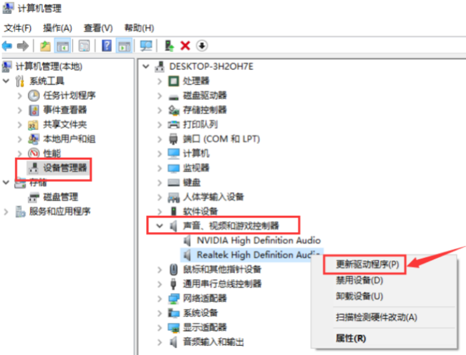 2、进入页面后点击左侧的“设备管理器”,然后展开“声音,视频和游戏控制器”选项,右键点击声卡驱动程序菜单栏,然后选择“更新驱动程序”选项。