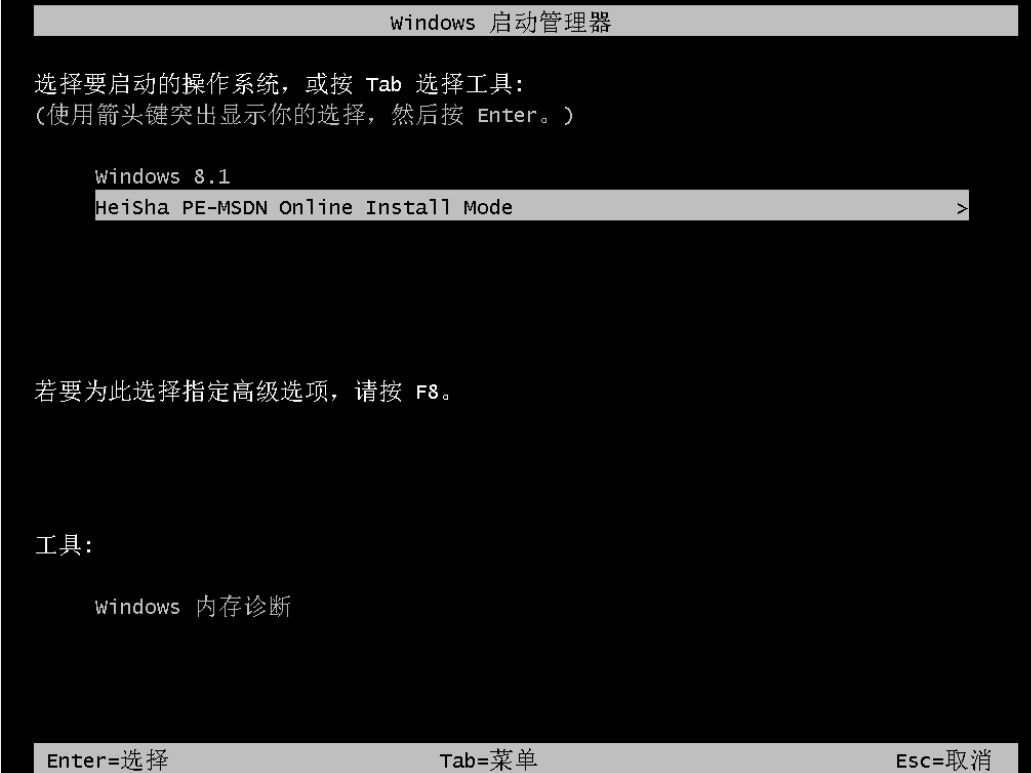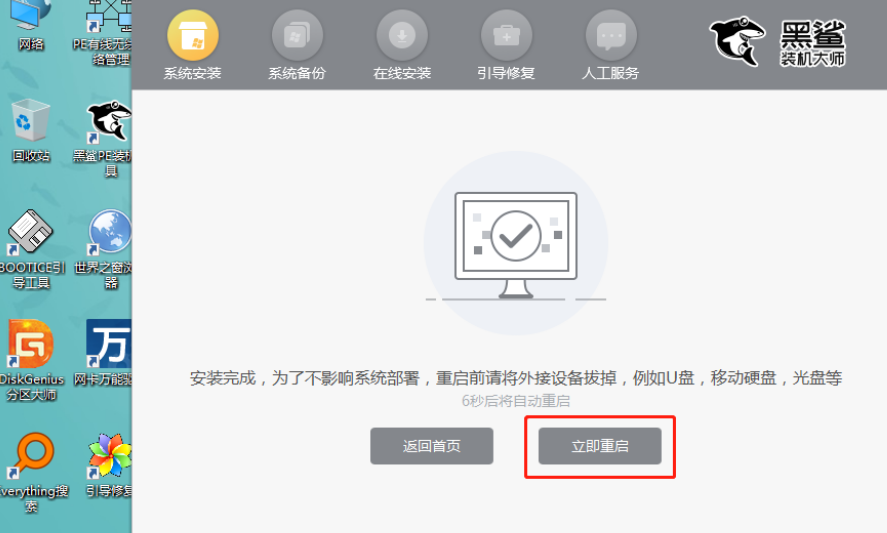 第七步环境部署完成后“立即重启”电脑,开始选择“HeiSha PE”模式回车进入。